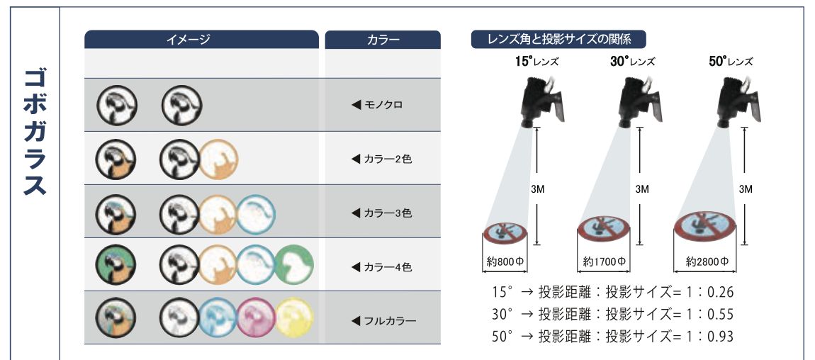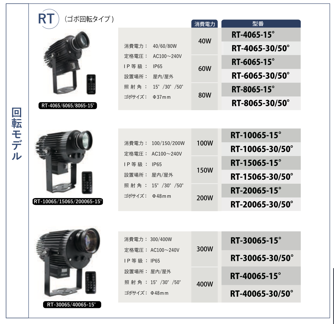 | 備考 | 静止モデル | 静止モデル | 回転モデル | 回転モデル | 回転モデル | 回転モデル・大容量(ゴボサイズΦ48mm) | 回転モデル・大容量(ゴボサイズΦ48mm) | 回転モデル・大容量(ゴボサイズΦ48mm) | 3パターン切替・リモコン付属 | 3パターン切替・リモコン付属 | 3パターン切替・リモコン付属 |